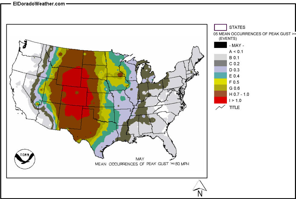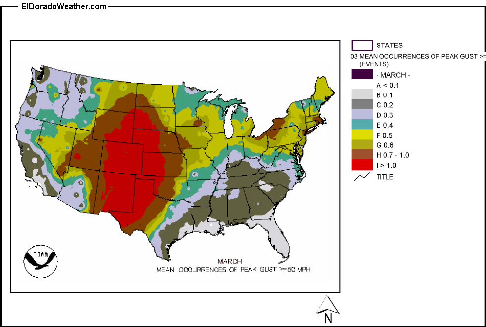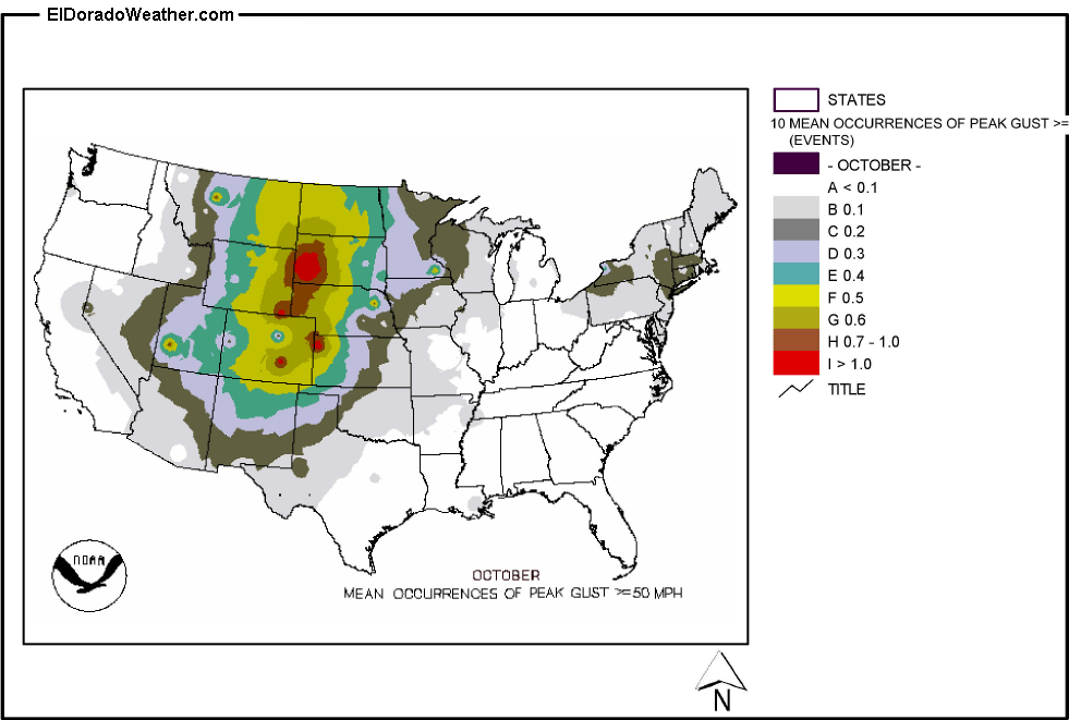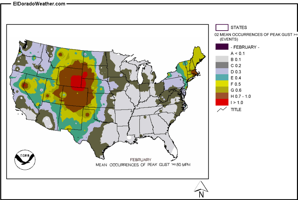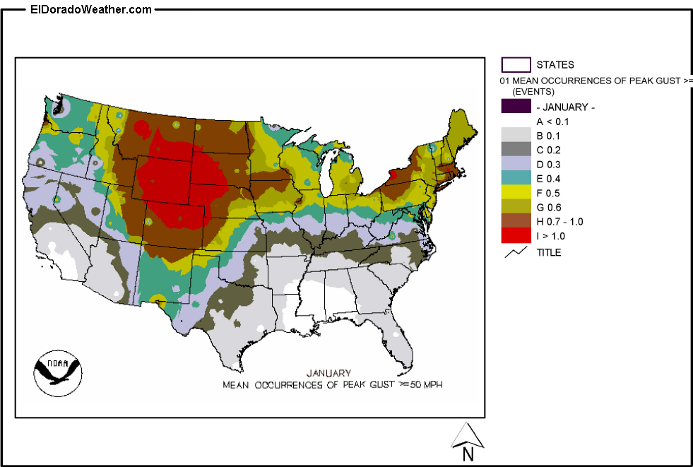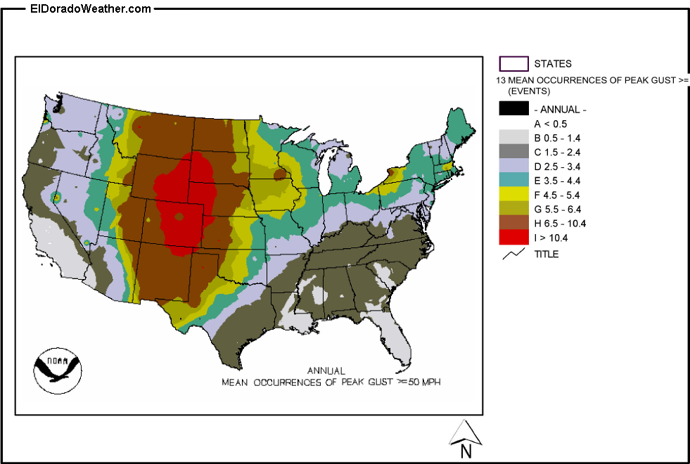 Mean Occurrences of Peak Gust Greater or Equal to 50 MPH