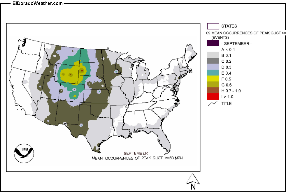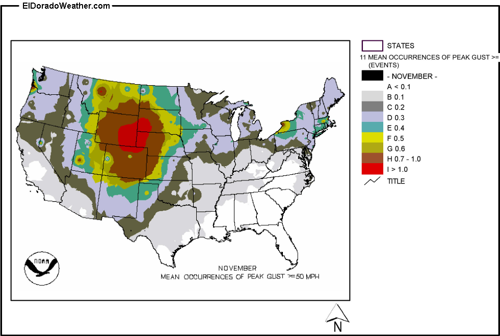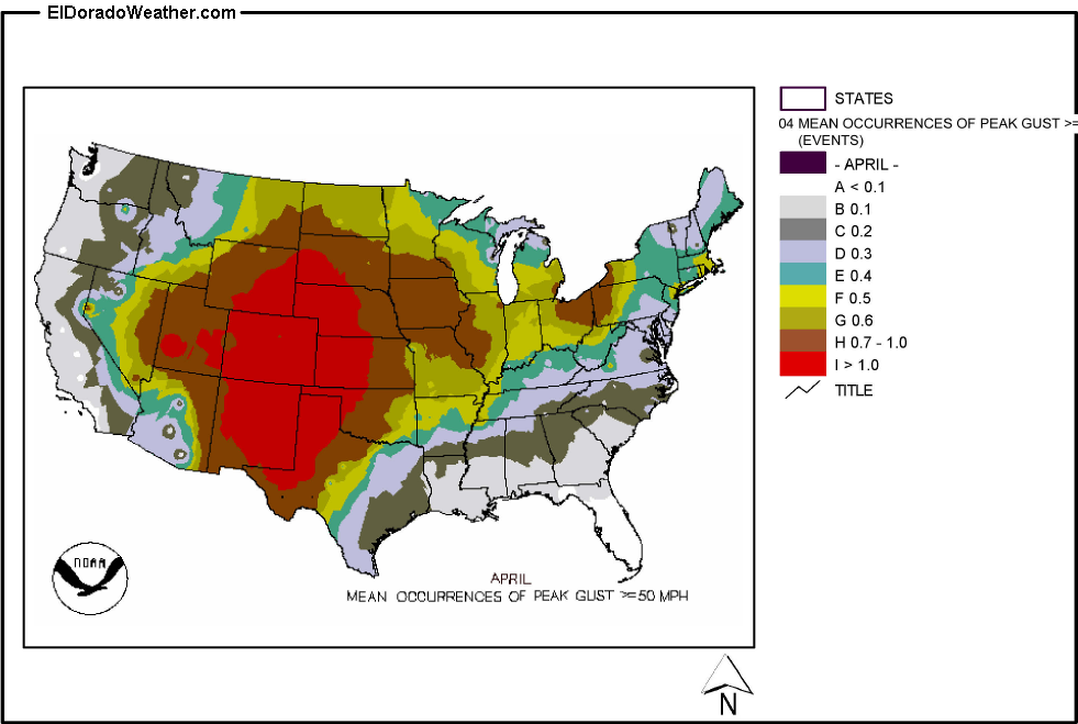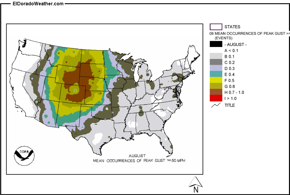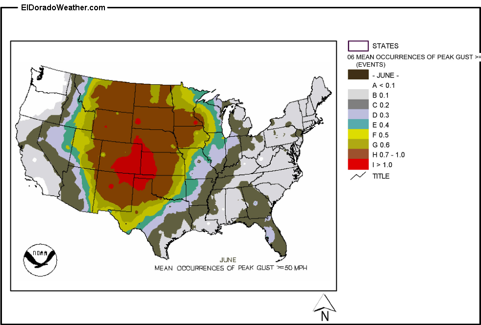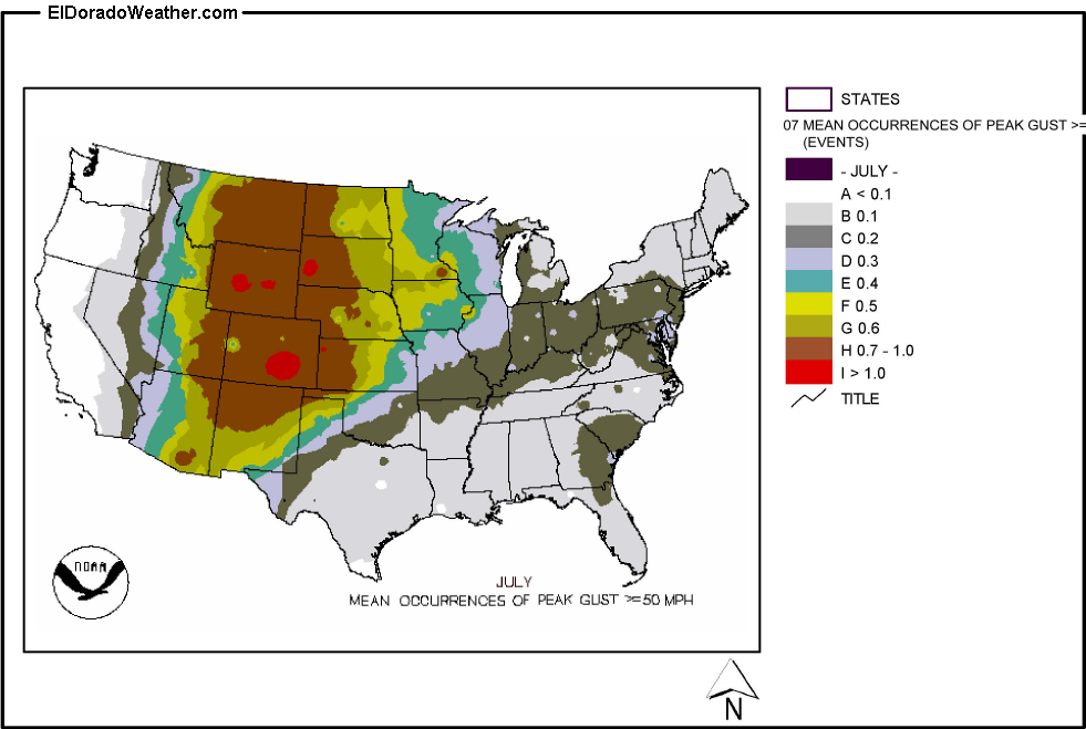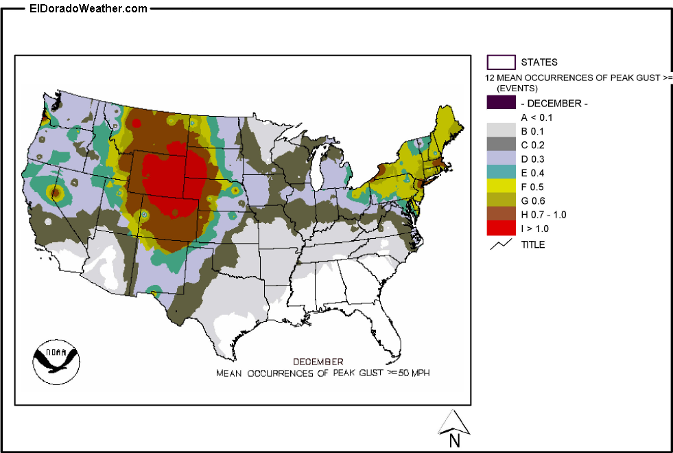 Mean Occurrences of Peak Gust Greater or Equal to 50 MPH
